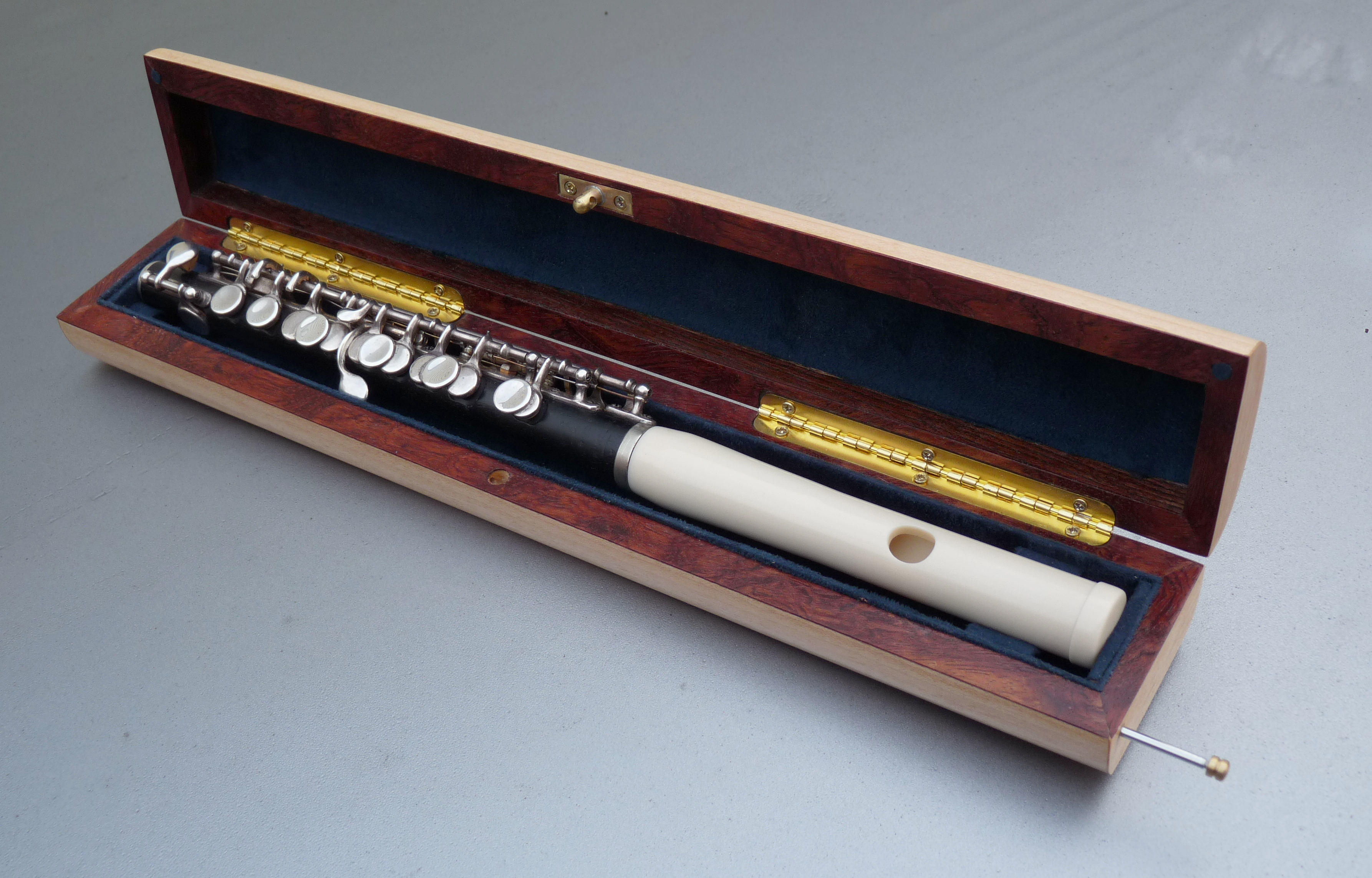 My cases are made in the style of some Louis Lot, Godfroy and Buffet cases I came across over the years - veneered, curved top profile extending to the bottom, straight sides, metal hinges, and, in particular, a drawn pin locking system that was used on Joseph Rampal's Louis Lot case. The lining is a suede material, often blue or purple. The wooden blocks are set up in the same way as in many vintage French cases. Mine are custom made to perfectly fit each flute. No squishy, self-molding foam is allowed. When the case closes, the top blocks rest gently on the flute tube to keep it from moving around. The headjoint is often placed facing the same direction as the body.