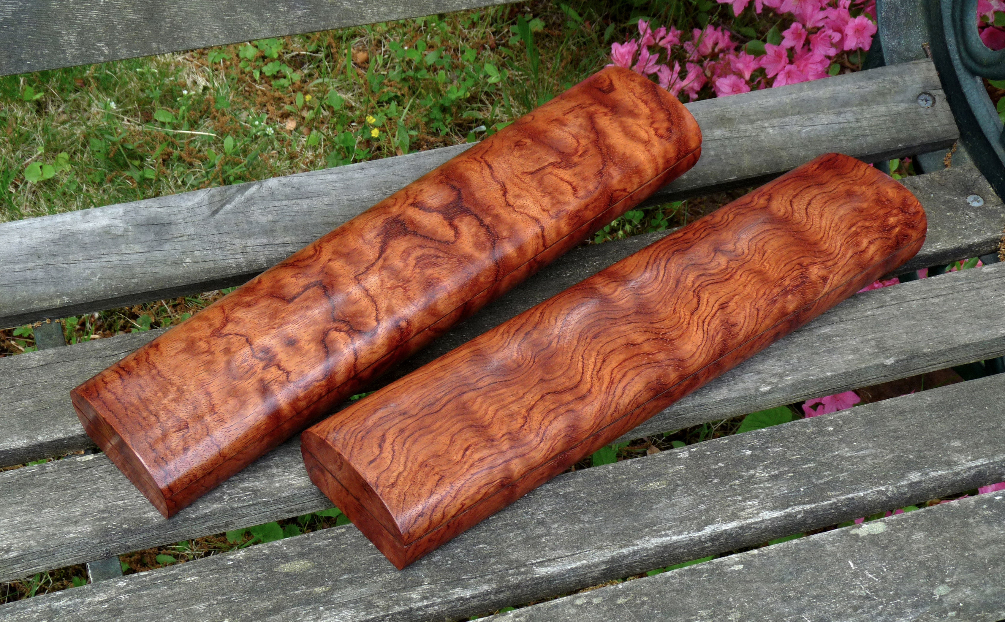 A pair of cases in waterfall Bubinga veneer.