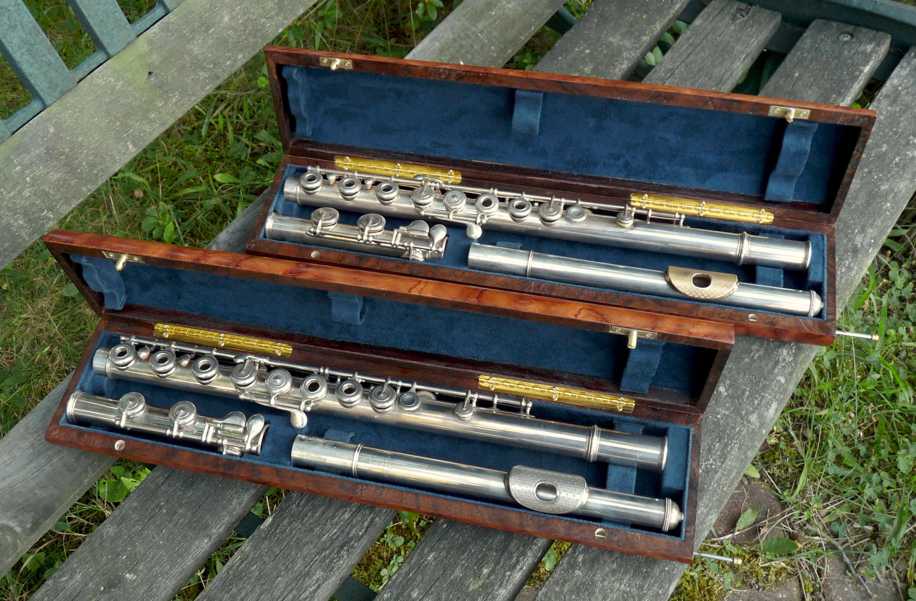 A pair of cases for a pair of early Louis Lot flutes with Dorus G#.