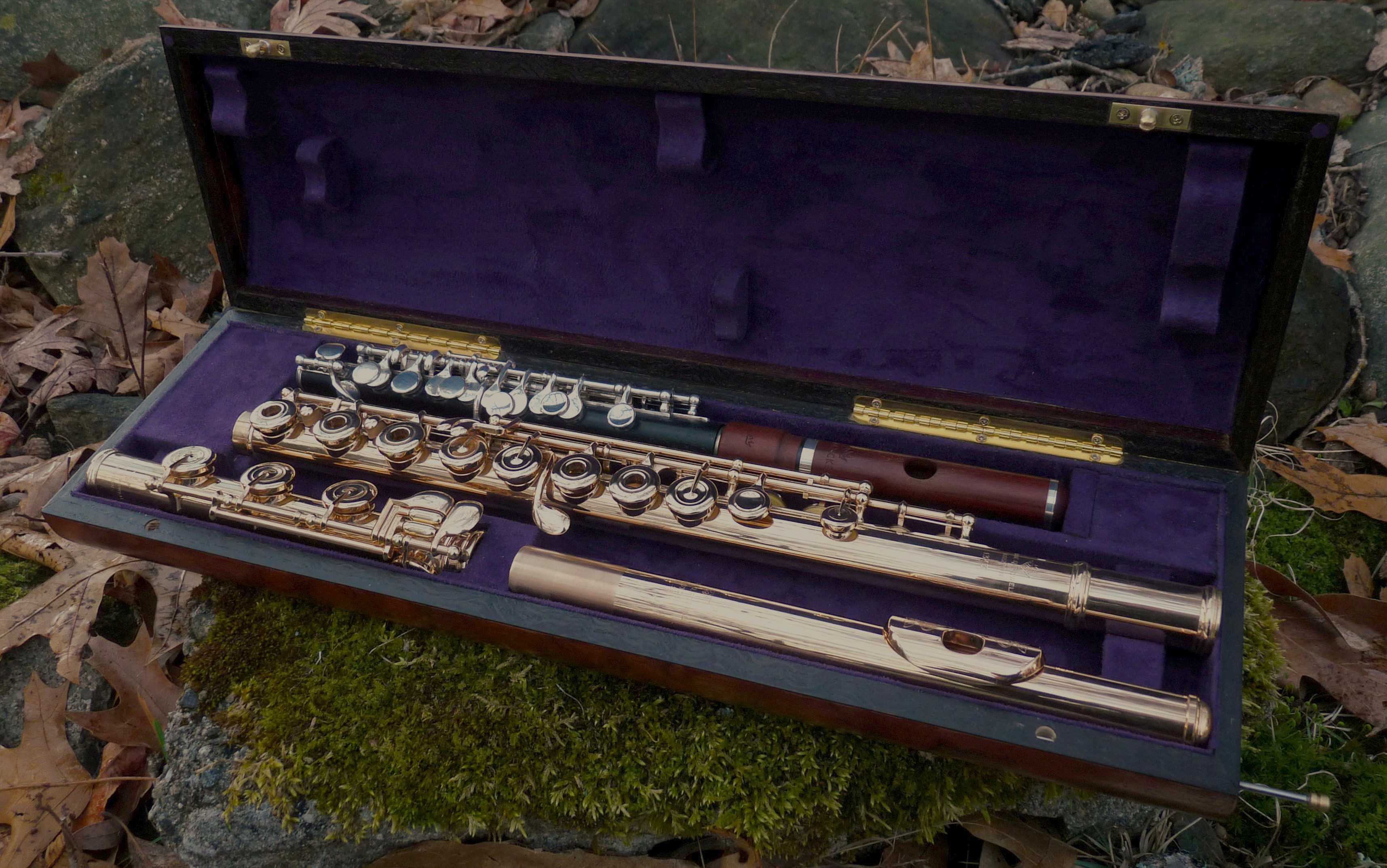 These cases are handmade one at a time in any configuration C-foot, B-foot, wood flute, conical flute, combination flute and piccolo, flute with two headjoints, baroque flute, alto flute, etc. Customization is welcome. The choice of veneer is limited to current market supply. The pin locking system can be tricky to operate and requires some dexterity and patience.